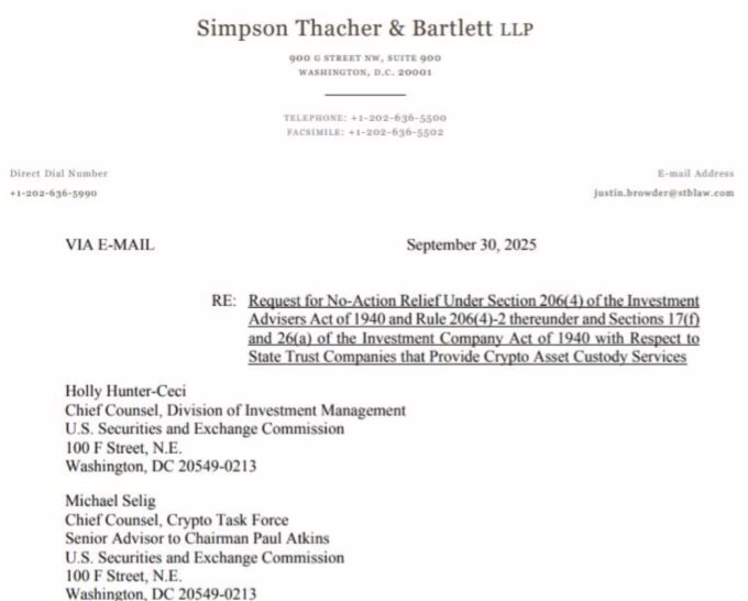 In its letter released Tuesday, the SEC’s Division of Investment Management said it would not recommend enforcement action against advisers who use state-chartered trust companies as custodians for crypto assets. The move came in response to a request from law firm Simpson Thacher & Bartlett, which sought assurance that registered institutions, including venture capital firms, would not face penalties for such custody practices.