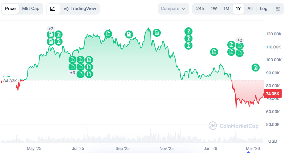 Bitcoin traders are closely watching an important event on March 20, where about $180 million worth of options contracts will expire. This could influence where Bitcoin’s price moves next. Right now, Bitcoin is trading around $74,000. That’s a solid recovery from its recent low near $62,500, but it’s still about 15% lower than it was a month ago.